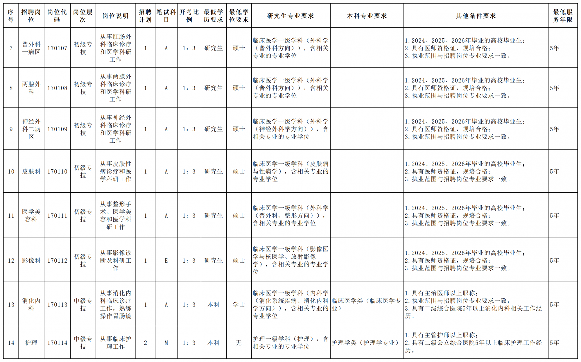 一、招聘岗位及要求 重症医学科、心内科一病区、呼吸与危重症医学科、放疗科、介入血管外科、胸外科、普外科一病区、两腺外科、神经外科二病区、皮肤科、医学美容科、影像科、消化内科、护理共16人。 在落实《淄博市人才金政50条》相关政策基础上,根据医院《人才队伍建设实施意见》规定,对引进人才发放安家补助费用: (一)博士研究生:80万元(税后); (二)住院医师规范化培训合格证和医师执业证“两证”齐全的硕士研究生:15万元(税后)。 三、招聘条件 (一)具有中华人民共和国国籍; (二)遵守中华人民共和国宪法和法律,拥护中国共产党领导和社会主义制度; (三)应聘初级岗位的,年龄在40周岁及以下(1985年2月以后出生);应聘中级专技岗位的,年龄应在45周岁及以下(1980年2月以后出生);应聘高级岗位的,年龄应在50周岁及以下(1975年2月以后出生); (四)具有良好的品行和职业道德和适应岗位的身体条件、心理素质; (五)符合招聘岗位要求的学历、学位、专业或技能要求,详见应聘须知(附件2); (六)符合招聘岗位的工作经历和其他要求; 工作经历是指与企业建立劳动关系并缴纳职工养老保险、在部队服役、被国家机关录用、被事业单位聘用期间的工作经历。毕业生在校期间的社会实践、实习、兼职等不能作为工作经历。工作经历年限按足年足月累计计算,时间截止到2026年2月。 (七)法律、法规规定的其他条件。 现役军人,在读的非应届毕业生,未满最低服务期限的公务员(含参照公务员法管理的人员),在公务员招考和事业单位公开招聘中被招考(聘)主管机关认定有严重违纪违规行为且不得应聘的人员,因犯罪受过刑事处罚的人员,被开除党籍的人员,被开除公职的人员,被依法列为失信联合惩戒对象的人员,以及法律法规规定不得聘用的其他情形人员不得应聘。 应聘人员不得报考有《事业单位人事管理回避规定》(人社部规〔2019〕1号)规定情形的岗位。 香港和澳门居民中的中国公民可应聘符合条件的岗位。 台湾居民可应聘符合条件的岗位。 公费医学生不可报考。 (八)在职人员(含已签订就业协议的人员,下同)应聘的,须征得所在单位(就业协议单位,下同)同意。定向委培应届毕业生应聘的,须征得定向委培单位同意。 在职人员是指与企业建立劳动关系、被国家机关录用、被事业单位聘用的人员。签订就业协议人员是指与单位签订初步就业协议的人员。 (九)根据《关于转发国卫办科教发〔2021〕18号文件的通知》(鲁卫科教字〔2021〕2号)文件精神,对经住培合格的本科学历临床医师,落实“两个同等对待”政策。 四、报名方式及时间 网上报名地址:淄博市卫生健康委员会官方网站 (http://ws.zibo.gov.cn/)、淄博市卫生健康事业发展中心官方网站 (http://www.zbwsrc.cn/)“通知公告”专栏。 报名时间:2026年2月26日09:00-3月3日16:00。 初审时间:2026年2月26日09:00-3月4日16:00。 缴费时间:2026年2月26日09:00-3月5日16:00。 招聘公告详见桓台县人民政府官网,网址链接如下: http://www.huantai.gov.cn/gongkai/site_htxwsjkj/channel_c_5f9f6c9be592f315dca00fae_5fb3bfbe607979429fbb998b/doc_699d3ebc3dc79e8438c7a869.html 五、联系方式 医院人力资源科电话:0533-8228128 公告网址:桓台县人民政府http://www.huantai.gov.cn/ 识别二维码查阅下载附件1-5 附件1:2026年桓台县人民医院公开招聘专业技术人员岗位一览表 附件2:2026年桓台县卫生健康系统事业单位公开招聘卫生专业技术人员应聘须知 附件3:应届毕业生说明(式样) 附件4:无业承诺书(式样) 附件5:同意应聘说明(式样)
