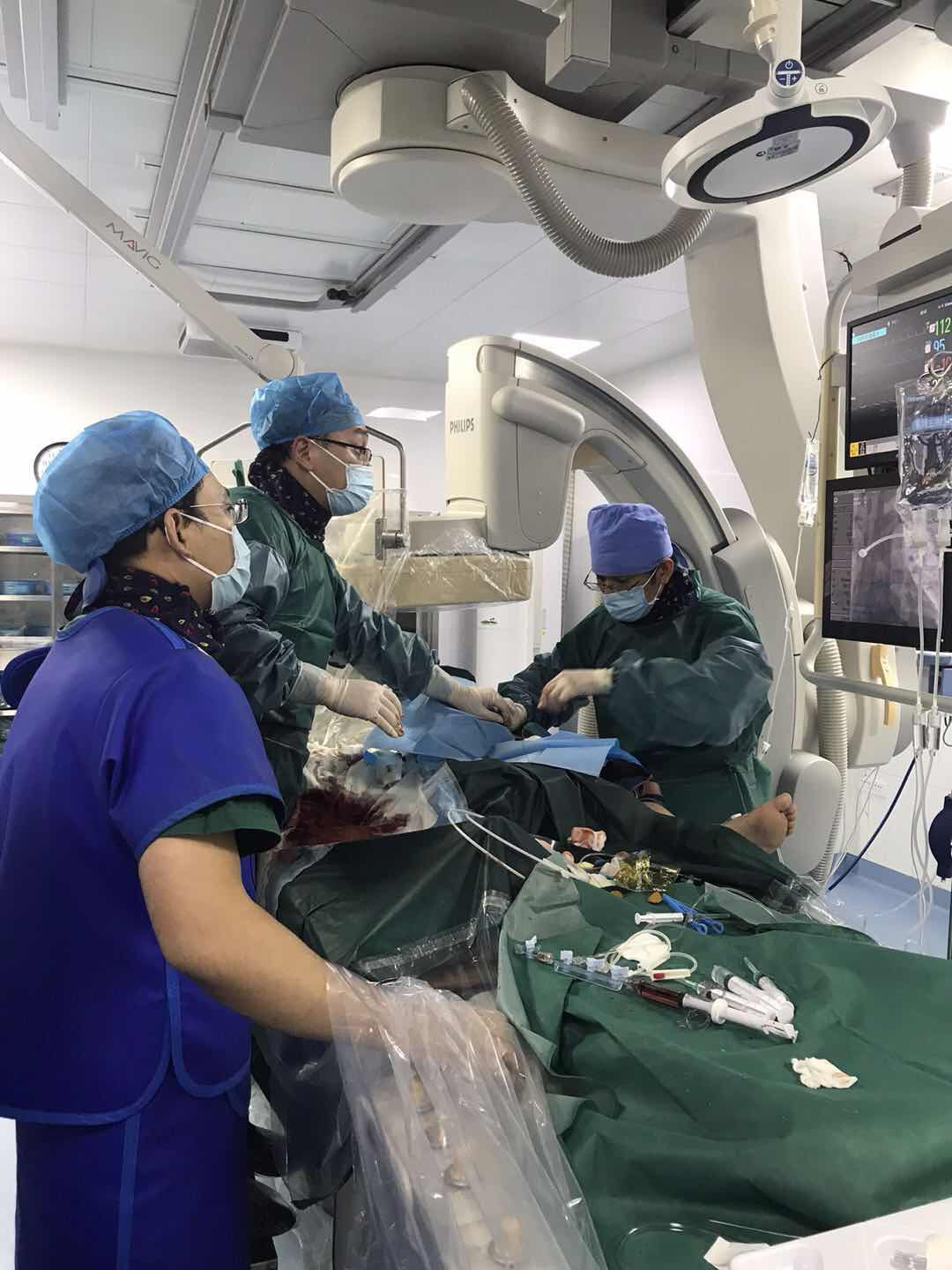 典型病例 2019年5月24日上午7点52分,桓台县人民医院胸痛中心接到电话,博兴地区有一名突发胸痛患者。急诊科医护人员迅速赶到现场,发现患者面色苍白,大汗淋漓,不停地喊“疼”,立即进行心电图检查并上传至胸痛中心。张宏斌主任远程会诊后,高度怀疑左主干病变,患者随时都有生命危险,建议尽快行急诊PCI手术。 8点43分,患者到达医院绕行急诊送至介入导管室,急诊PCI团队、重症监护室、麻醉科早已做好手术准备。麻醉科公衍福主任为患者进行气管插管,心内科一病区王磊主任以熟练地技术迅速完成造影检查,但当看到患者血管的那一刻,所有手术人员都倒吸了一口凉气。冠脉造影示患者三条血管闭塞,其中左冠状动脉主干狭窄程度达到99%,要知道未经介入治疗的左主干急性闭塞患者死亡率几乎为100%! 张宏斌主任果断决策,为患者进行主动脉球囊反搏(IABP)辅助下支架植入术处理左主干闭塞。重症监护室张宗玉主任、急诊科赵衍华主任为患者进行IABP植入。此例患者血管条件极差,多支病变不说,内膜还极不光滑,且患者患有严重前列腺增生,尿储留导致患者一直躁动不安,不配合手术。急诊PCI团队紧急请泌尿外科值班医师会诊,尿液顺利引出后,患者明显安稳了,置入三枚支架后,患者堵塞血管恢复血流。 术后,患者带呼吸机、IABP泵转往重症医学科,生命体征平稳后,转至心内科一病区,经过医护人员悉心照料于6月5日康复出院。 此次抢救,我院医生团结协作、沉着冷静,克服了一道道难关,最终让患者转危为安,从患者到达医院到球囊扩张时间仅用了47分钟。胸痛中心团队无缝隙衔接为抢救急性心梗病人赢得了最宝贵的时间,多科室协同作战,把患者从死亡线上拉了回来。 桓台县人民医院胸痛中心是国家级胸痛中心,作为综合性医院,对于危重心梗疾病提供多学科联合诊疗模式,自2016年底成立以来,已成功救治400多名急性心肌梗死患者。 桓台县人民医院心内介入团队开展冠脉介入手术4000多例,能独立处理复杂病变、疑难病变,能独立开展射频消融、冠状动脉旋磨等省级医院才能完成的介入技术。科室聘请首都医科大学附属北京康复医院心脏康复中心王立中教授每周四来院进行会诊及介入手术治疗。 胸痛中心电话:0533-8216999 心内科预约电话: 心内科一病区:0533-8228826 心内科二病区:0533-8228827 介入导管室:0533-8228165