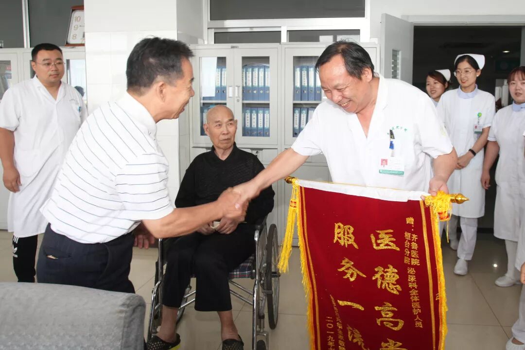 7月15日下午,一位坐着轮椅的患者和家属为桓台县人民医院泌尿外科毕玉东主任送来一面锦旗,感谢毕主任精湛的技术和认真负责的工作态度,也感谢泌尿外科的精心治疗。