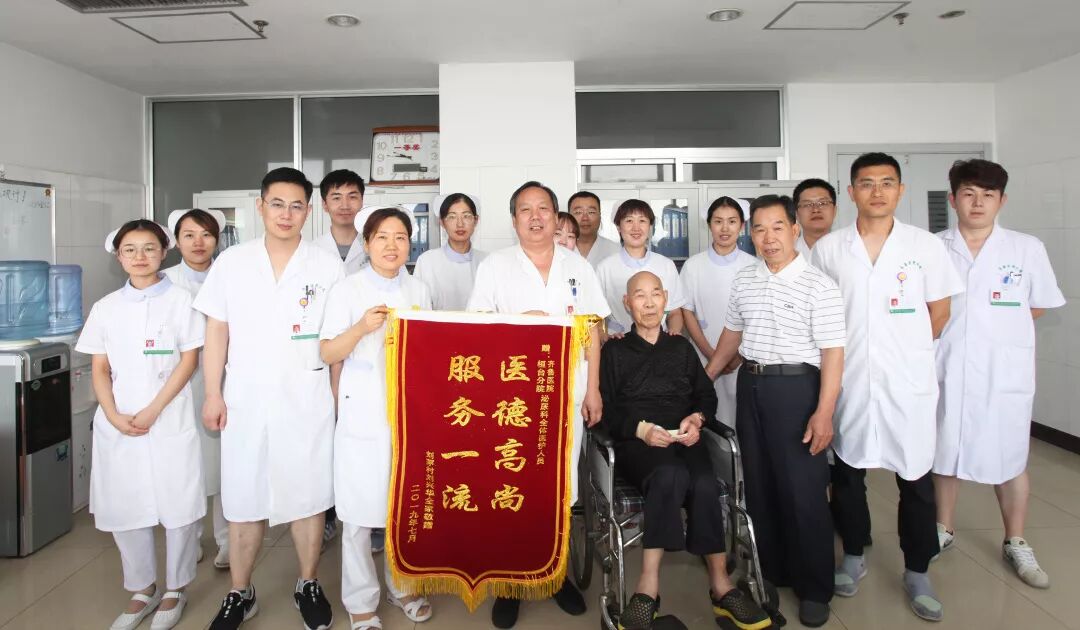 刘大爷是一名离休老干部,是泌尿外科的老病号,今年已经90岁高龄了,因有头部外伤和脑梗的病史,左侧肢体活动不灵,下地活动也只能靠轮椅辅助,3年前查出有前列腺肿瘤,开始定期到泌尿外科进行抗肿瘤治疗。 刘大爷第一次来院治疗,便感受到了毕玉东主任以及泌尿外科医护人员的热情服务,耐心地沟通,不厌其烦地告知住院治疗注意事项,帮助翻身、活动肢体、进行饮食指导等,慢慢便与刘大爷一家熟悉起来。从那以后,刘大爷不但每次复查都到泌尿外科,就连其他疾病,也会先找毕主任检查咨询,用他的话说,“毕主任给我治疗我最放心了!” 一周前,刘大爷突然出现寒战,体温到了40℃,还吐出大量咖啡色的呕吐物,肚子也疼得厉害,可把家里人给吓坏了,直接把刘大爷送到了泌尿外科病房。刘大爷来院时已是晚上六点,毕玉东主任刚结束科室晚查房,看到刘大爷的情况后,赶紧放下手头的工作,为患者建立静脉通道,进行心电监护、吸氧、抽血检查等急救措施,紧急请呼吸内科、胃肠外科、ICU等科室进行会诊。经过检查,初步考虑为急性感染,立即进行抗感染治疗,及时控制了炎症进展。第二天,刘大爷症状明显好转,可以进食了。这一次,刘大爷说什么也要送一面锦旗表示感谢。 泌尿外科毕玉东主任:“尽最大努力为患者提供高质量服务,解除患者痛苦是我们秉承的原则,刘大爷是为社会做过贡献的老革命、老干部,目前医院有巡诊离休干部的活动,我们一定会竭尽所能,为老人们服务好!”