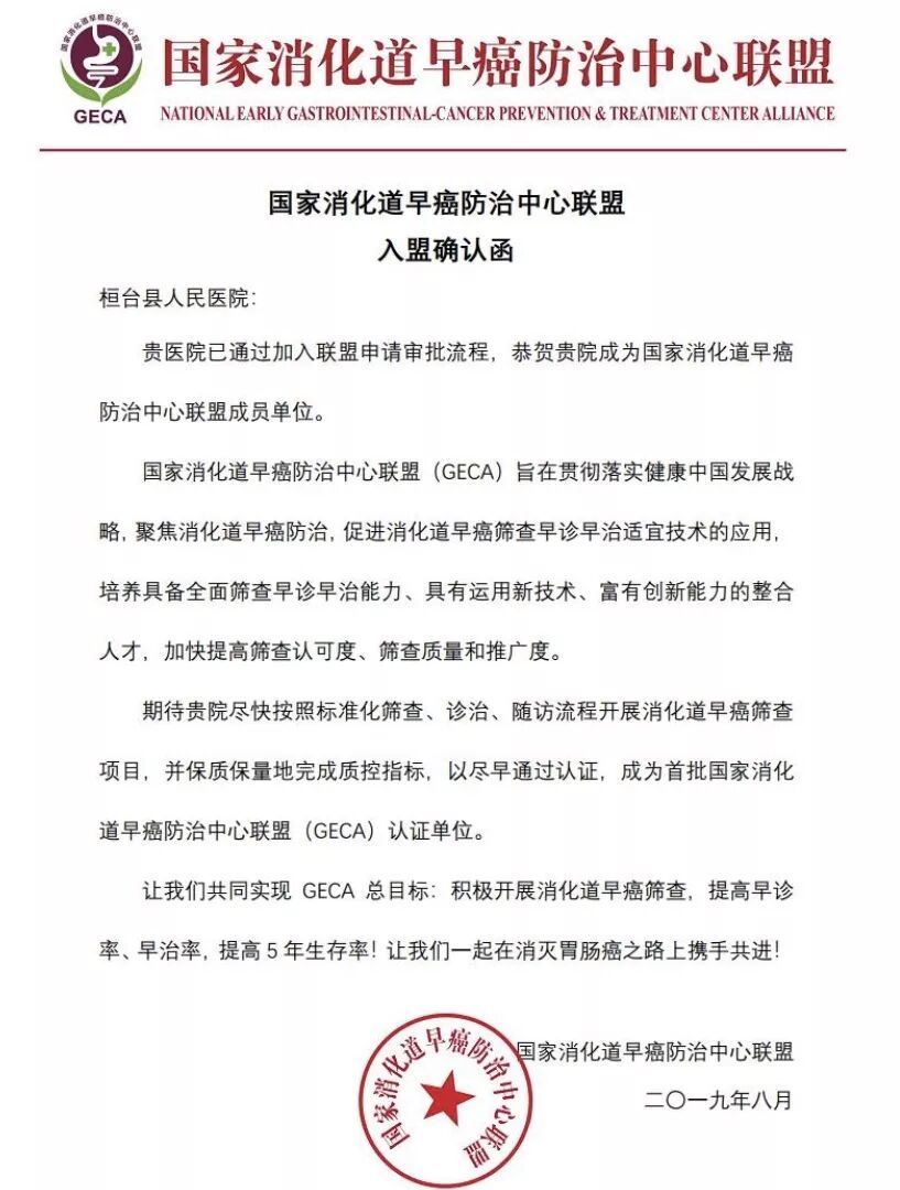 近日,桓台县人民医院接到国家消化道早癌防治中心联盟通知,正式成为国家消化道早癌防治中心联盟成员单位。