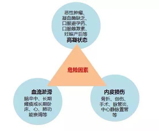 各种原因引起的静脉壁的损伤、血液高凝状态、静脉血流滞缓。