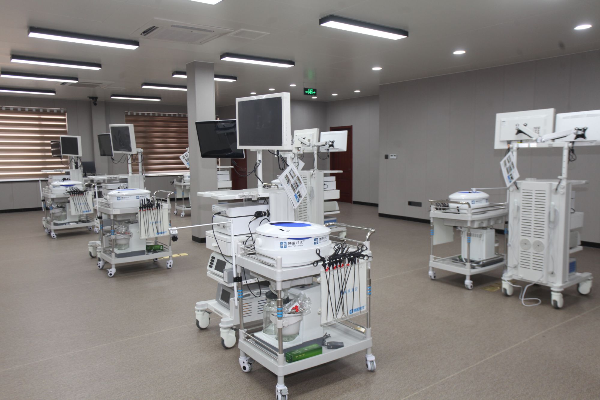 桓台县微创手术培训中心面积200多平方米,分为干式训练区、湿式训练区、模块储备区等8个功能区。配置6套教学用高清腹腔镜系统,同时配备智慧讲台,中控系统,手术室转播系统等,可同时容纳12人同场训练,20人现场观摩、听课。引进全套规范化培训体系,使用真实动物器官模拟人体器官,通过系统化训练,提升临床医生的腹腔镜基本操作能力,规范设备器械的应用,掌握各术式操作要点及流程,增强对手术并发症预防和处理能力,保证手术质量,保障人民群众的健康安全。